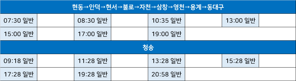 부남시외고속버스터미널 부남정류장 부남정류소 청송부남터미널 → "청송,현동→안덕→현서→불로→자천→삼창→영천→용계→동대구".