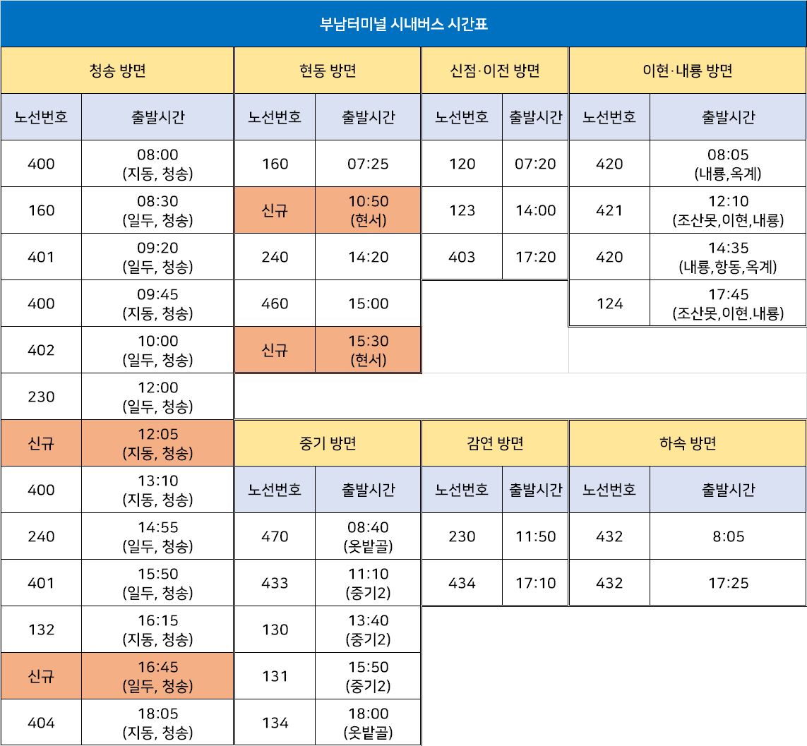 부남시외버스터미널 출발 시외버스 시간표/요금표 2025년 03월 23일 기준