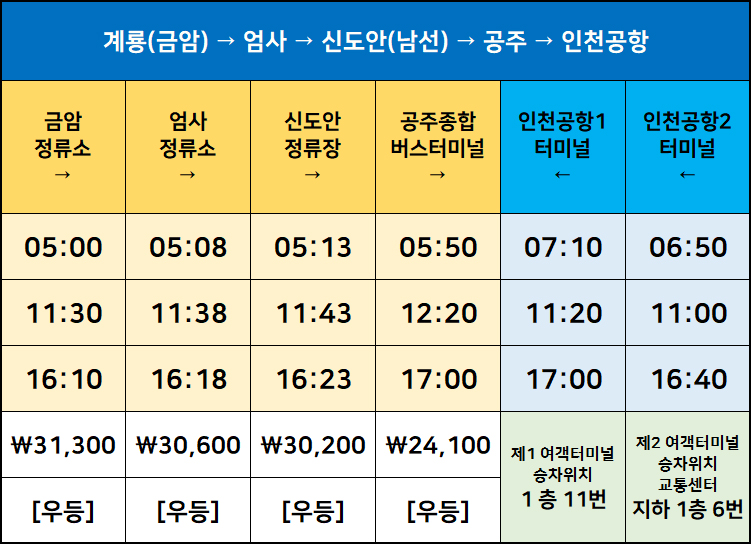 인천공항2터미널 → 인천공항1터미널 → 공주 → 남선(신도안) → 엄사 → 계룡금암