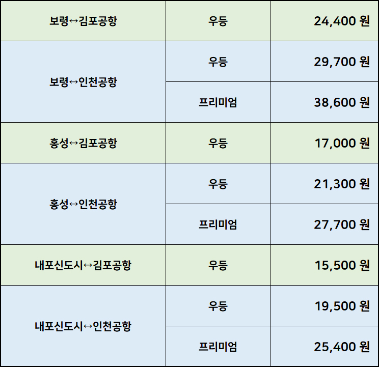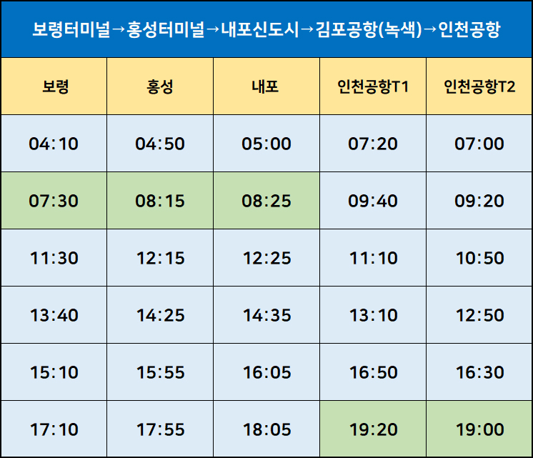 보령터미널 ↔ 홍성터미널 ↔ 내포신도시 ↔ 김포공항(녹색 만 -경유) ↔ 인천공항