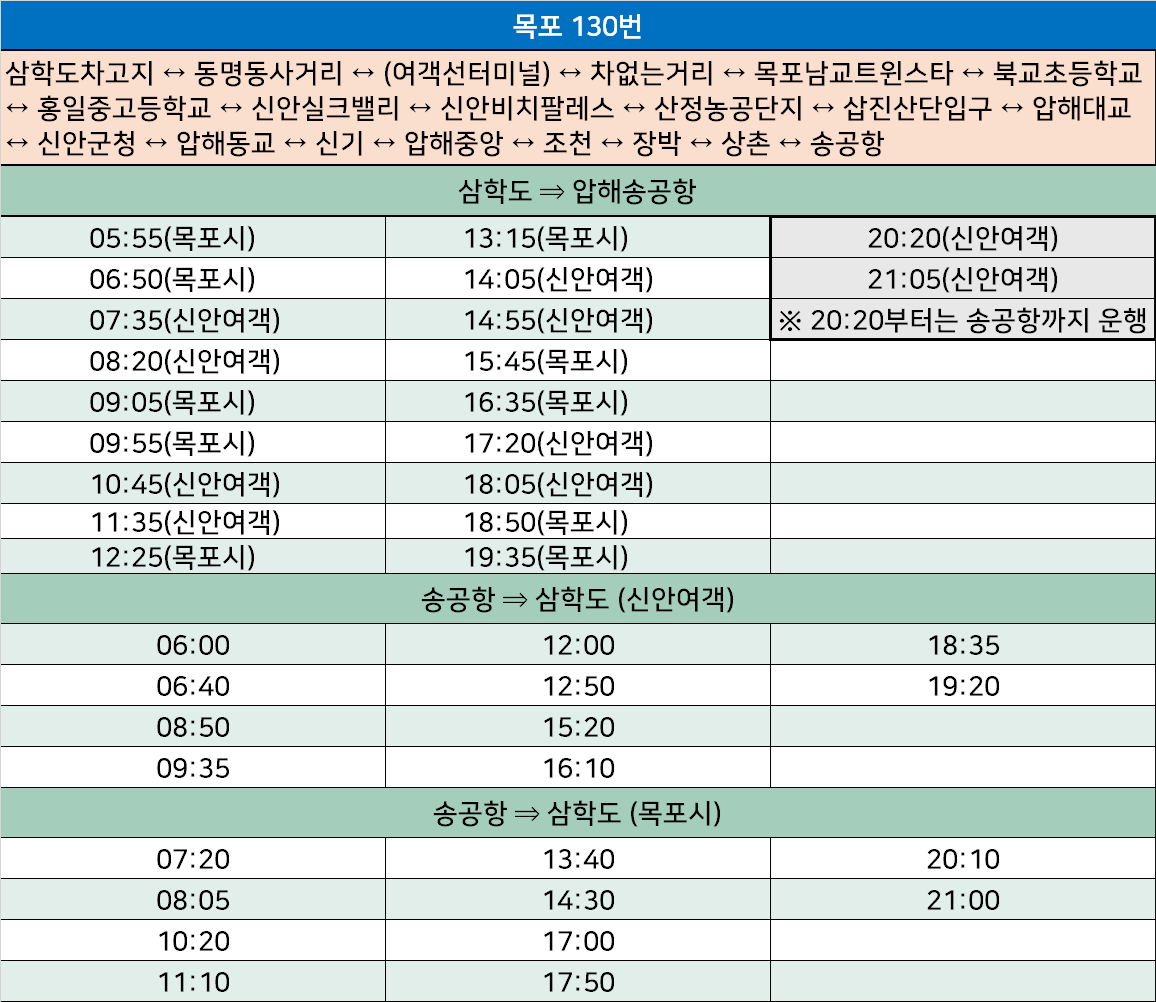 목포 130번: 삼학도차고지 ↔ 동명동사거리 ↔ (여객선터미널) ↔ 차없는거리 ↔ 목포남교트윈스타 ↔ 북교초등학교 ↔ 홍일중고등학교 ↔ 신안실크밸리 ↔ 신안비치팔레스 ↔ 산정농공단지 ↔ 삽진산단입구 ↔ 압해대교 ↔ 신안군청 ↔ 압해동교 ↔ 신기 ↔ 압해중앙 ↔ 조천 ↔ 장박 ↔ 상촌 ↔ 송공항