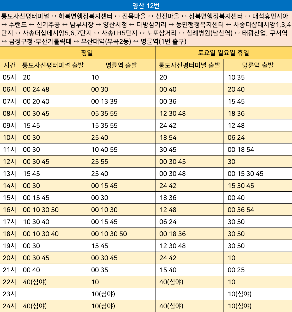 양산 12번: 통도사신평터미널 ↔ 하북면행정복지센터 ↔ 진목마을 ↔ 신전마을 ↔ 상북면행정복지센터 ↔ 대석휴먼시아 ↔ 수랜드 ↔ 신기주공 ↔ 남부시장 ↔ 양산시청 ↔ 다방삼거리 ↔ 동면행정복지센터 ↔ 사송더샵데시앙1,3,4단지 ↔ 사송더샵데시앙5,6,7단지 ↔ 사송LH5단지 ↔ 노포삼거리 ↔ 침례병원(남산역) ↔ 태광산업, 구서역 ↔ 금정구청·부산가톨릭대 ↔ 부산대역(부곡2동) ↔ 명륜역(1번 출구)