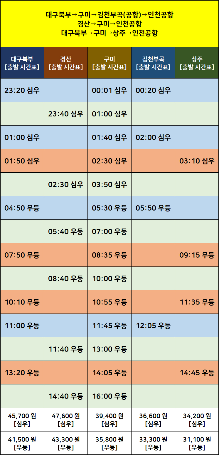 대구북부 → 구미 → 상주 → 인천공항 T1 → 인천공항 T2