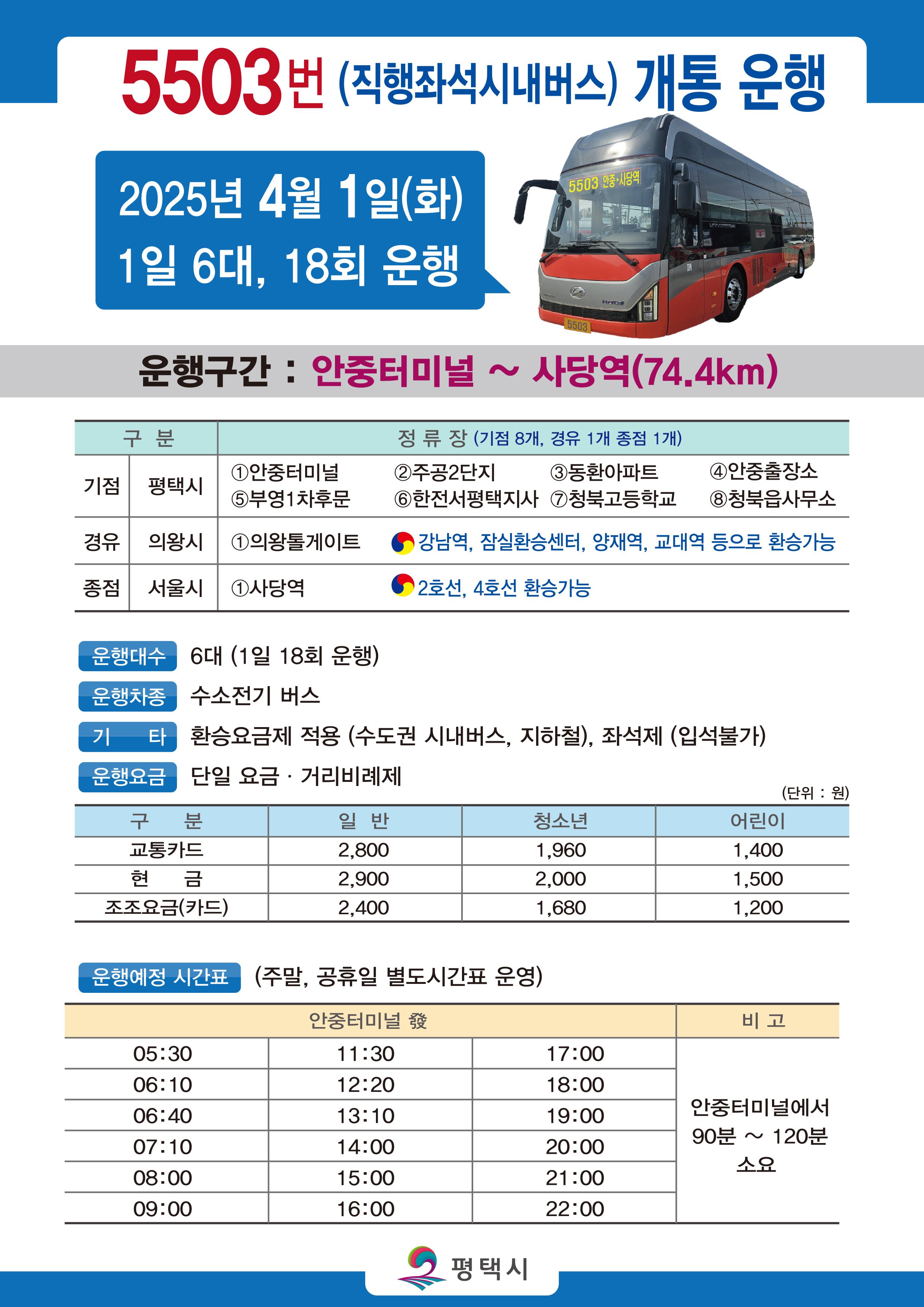 평택 5503번: 안중버스터미널 ↔ 안중주공2단지(상) ↔ 현화중학교(하) ↔ 동환아파트(상) ↔ 현일초교(하) ↔ 안중출장소 ↔ 부영1차후문 ↔ 한전서평택지사 ↔ 청북고등학교.한양수자인 ↔ 청북읍사무소.신포 ↔ 사당역(승차:9번출구, 하차:중앙차로) ↔ 의왕톨게이트 ↔ 서울(의왕/사당역)