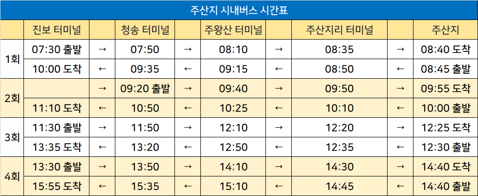 주산지리 공용버스터미널 시간표/요금표 2025년 03월 23일 기준