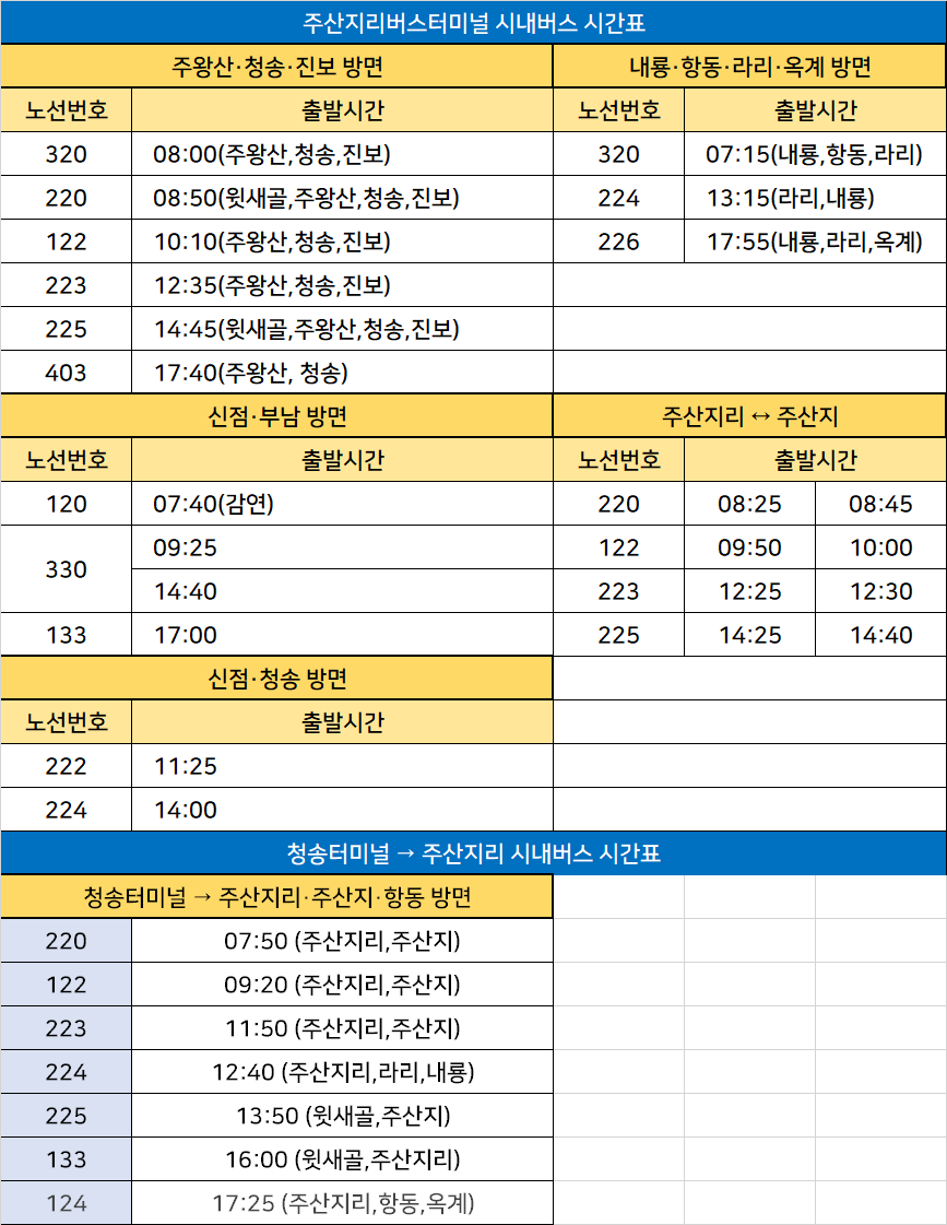 주산지리 시내버스 노선정보: 주왕산·청송·진보, 내룡·항동·라리·옥계, 신점·부남, 주산지리 ↔ 주산지, 신점·청송, 윗새골, 감연