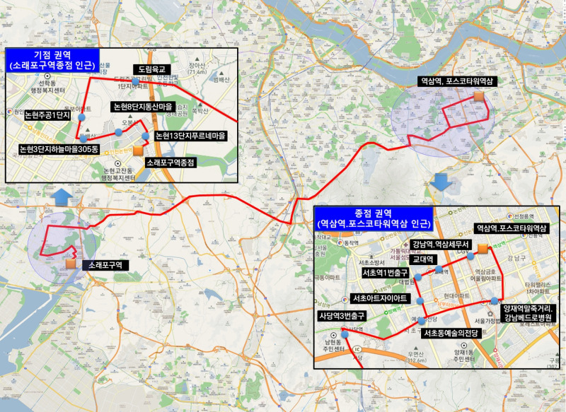 소래포구역종점→논현13단지푸르네마을→논현8단지동산마을→논현3단지하늘마을305동→논현주공1단지→도림육교→신천IC(미정차)→안현JC(경유)→광명IC(경유)→금천(미정차)→봉천터널진입(미정차)→사당IC출입(미정차)→사당역3번출구→서초아트자이아파트→서초역1번출구→교대역→삼성서초역삼세무서→역삼역.포스코타워역삼→양재역말죽거리.강남베드로병원→서초동예술의전당→사당역14번출구→사당IC진입(미정차)→관악IC(미정차)→금천(미정차)→소하JC(미정차)→광명IC(경유)→안현JC(미정차)→신천IC(미정차)→도림아이파크아파트→논현주공2단지→논현3단지하늘마을305동→논현8단지동산마을→논현12단지산뒤마을→소래포구역종점