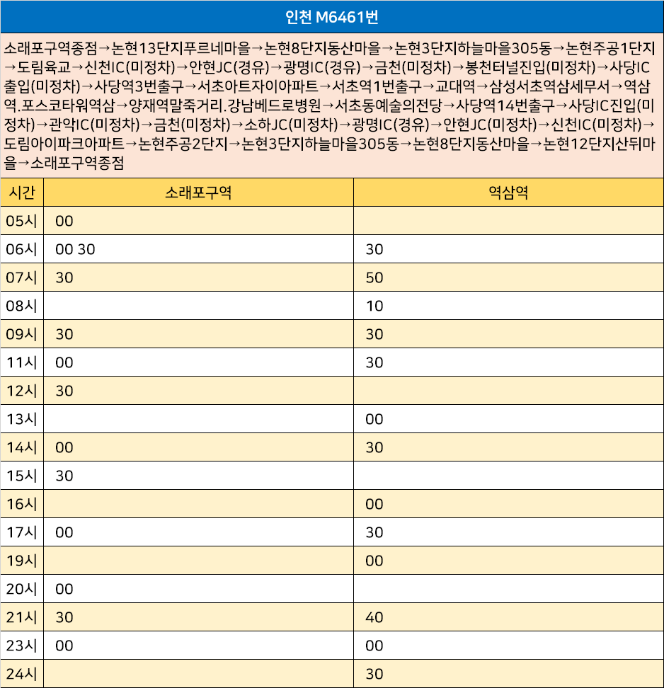 인천 M6461번: 소래포구역종점→논현13단지푸르네마을→논현8단지동산마을→논현3단지하늘마을305동→논현주공1단지→도림육교→신천IC(미정차)→안현JC(경유)→광명IC(경유)→금천(미정차)→봉천터널진입(미정차)→사당IC출입(미정차)→사당역3번출구→서초아트자이아파트→서초역1번출구→교대역→삼성서초역삼세무서→역삼역.포스코타워역삼→양재역말죽거리.강남베드로병원→서초동예술의전당→사당역14번출구→사당IC진입(미정차)→관악IC(미정차)→금천(미정차)→소하JC(미정차)→광명IC(경유)→안현JC(미정차)→신천IC(미정차)→도림아이파크아파트→논현주공2단지→논현3단지하늘마을305동→논현8단지동산마을→논현12단지산뒤마을→소래포구역종점