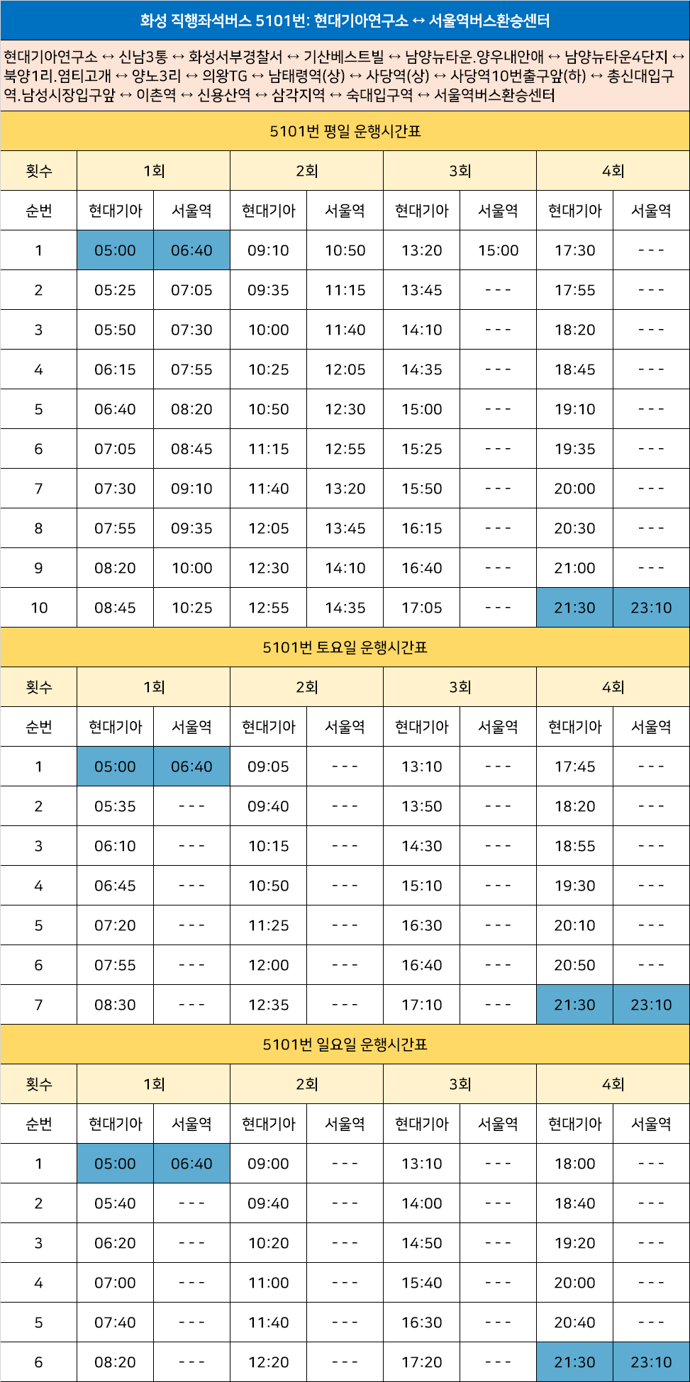 화성 직행좌석버스 5101번: 현대기아연구소 ↔ 신남3통 ↔ 화성서부경찰서 ↔ 기산베스트빌 ↔ 남양뉴타운.양우내안애 ↔ 남양뉴타운4단지 ↔ 북양1리.염티고개 ↔ 양노3리 ↔ 의왕TG ↔ 남태령역(상) ↔ 사당역(상) ↔ 사당역10번출구앞(하) ↔ 총신대입구역.남성시장입구앞 ↔ 이촌역 ↔ 신용산역 ↔ 삼각지역 ↔ 숙대입구역 ↔ 서울역버스환승센터