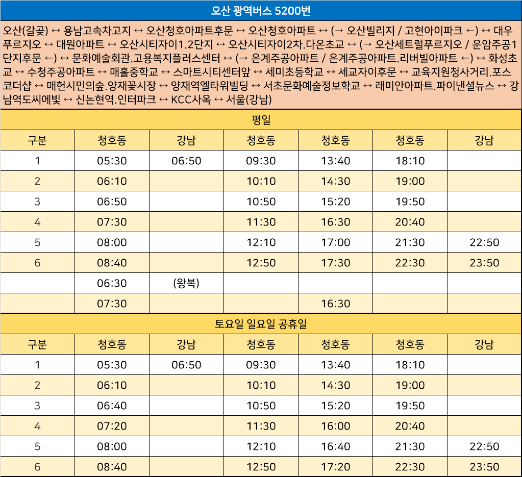 오산 광역버스 5200번: 오산(갈곶) ↔ 용남고속차고지 ↔ 오산청호아파트후문 ↔ 오산청호아파트 ↔ (→ 오산빌리지 / 고현아이파크 ←) ↔ 대우푸르지오 ↔ 대원아파트 ↔ 오산시티자이1.2단지 ↔ 오산시티자이2차.다온초교 ↔ (→ 오산세트럴푸르지오 / 운암주공1단지후문 ←) ↔ 문화예술회관.고용복지플러스센터 ↔ (→ 은계주공아파트 / 은계주공아파트.리버빌아파트 ←) ↔ 화성초교 ↔ 수청주공아파트 ↔ 매홀중학교 ↔ 스마트시티센터앞 ↔ 세미초등학교 ↔ 세교자이후문 ↔ 교육지원청사거리.포스코더샵 ↔ 매헌시민의숲.양재꽃시장 ↔ 양재역엘타워빌딩 ↔ 서초문화예술정보학교 ↔ 래미안아파트.파이낸셜뉴스 ↔ 강남역도씨에빛 ↔ 신논현역.인터파크 ↔ KCC사옥 ↔ 서울(강남)