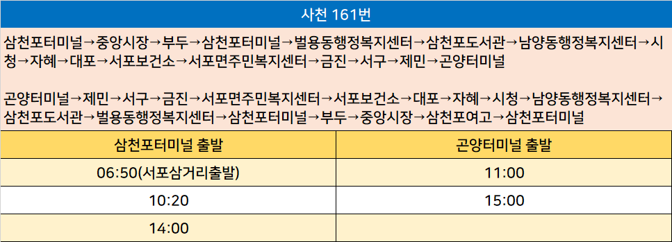 사천 161번: 삼천포터미널→중앙시장→부두→삼천포터미널→벌용동행정복지센터→삼천포도서관→남양동행정복지센터→시청→자혜→대포→서포보건소→서포면주민복지센터→금진→서구→제민→곤양터미널 / 곤양터미널→제민→서구→금진→서포면주민복지센터→서포보건소→대포→자혜→시청→남양동행정복지센터→삼천포도서관→벌용동행정복지센터→삼천포터미널→부두→중앙시장→삼천포여고→삼천포터미널