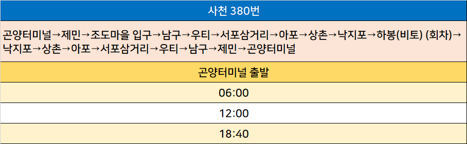 사천 380번: 곤양터미널→제민→조도마을 입구→남구→우티→서포삼거리→아포→상촌→낙지포→하봉(비토) (회차)→낙지포→상촌→아포→서포삼거리→우티→남구→제민→곤양터미널