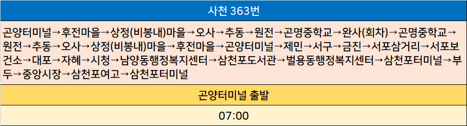 사천 363번: 곤양터미널→후전마을→상정(비봉내)마을→오사→추동→원전→곤명중학교→완사(회차)→곤명중학교→원전→추동→오사→상정(비봉내)마을→후전마을→곤양터미널→제민→서구→금진→서포삼거리→서포보건소→대포→자혜→시청→남양동행정복지센터→삼천포도서관→벌용동행정복지센터→삼천포터미널→부두→중앙시장→삼천포여고→삼천포터미널