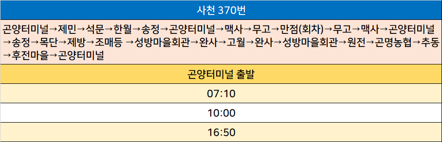 사천 370번: 곤양터미널→제민→석문→한월→송정→곤양터미널→맥사→무고→만점(회차)→무고→맥사→곤양터미널→송정→목단→제방→조매등 →성방마을회관→완사→고월→완사→성방마을회관→원전→곤명농협→추동→후전마을→곤양터미널