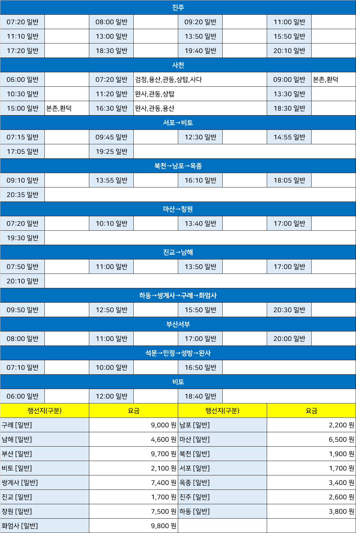 곤양 공용 시외버스 터미널 시간표/요금표 2025년 03월 31일 기준