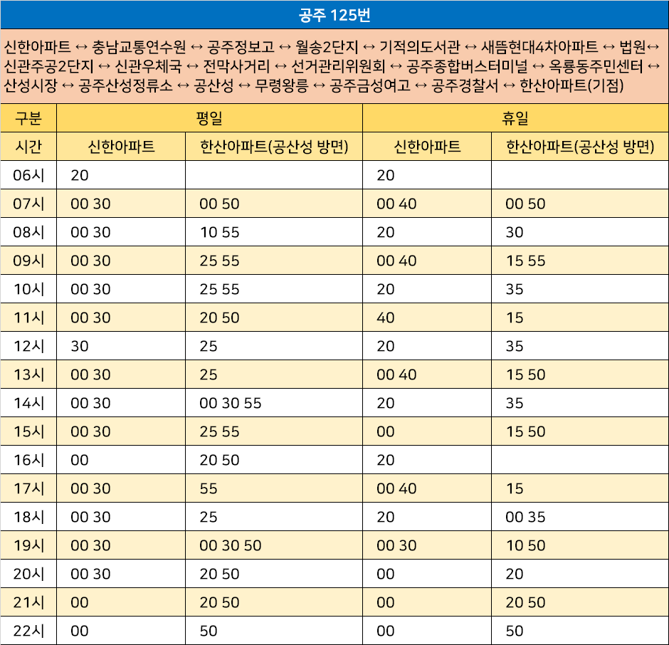 공주 125번: 신한아파트 ↔ 충남교통연수원 ↔ 공주정보고 ↔ 월송2단지 ↔ 기적의도서관 ↔ 새뜸현대4차아파트 ↔ 법원↔ 신관주공2단지 ↔ 신관우체국 ↔ 전막사거리 ↔ 선거관리위원회 ↔ 공주종합버스터미널 ↔ 옥룡동주민센터 ↔ 산성시장 ↔ 공주산성정류소 ↔ 공산성 ↔ 무령왕릉 ↔ 공주금성여고 ↔ 공주경찰서 ↔ 한산아파트(기점)
