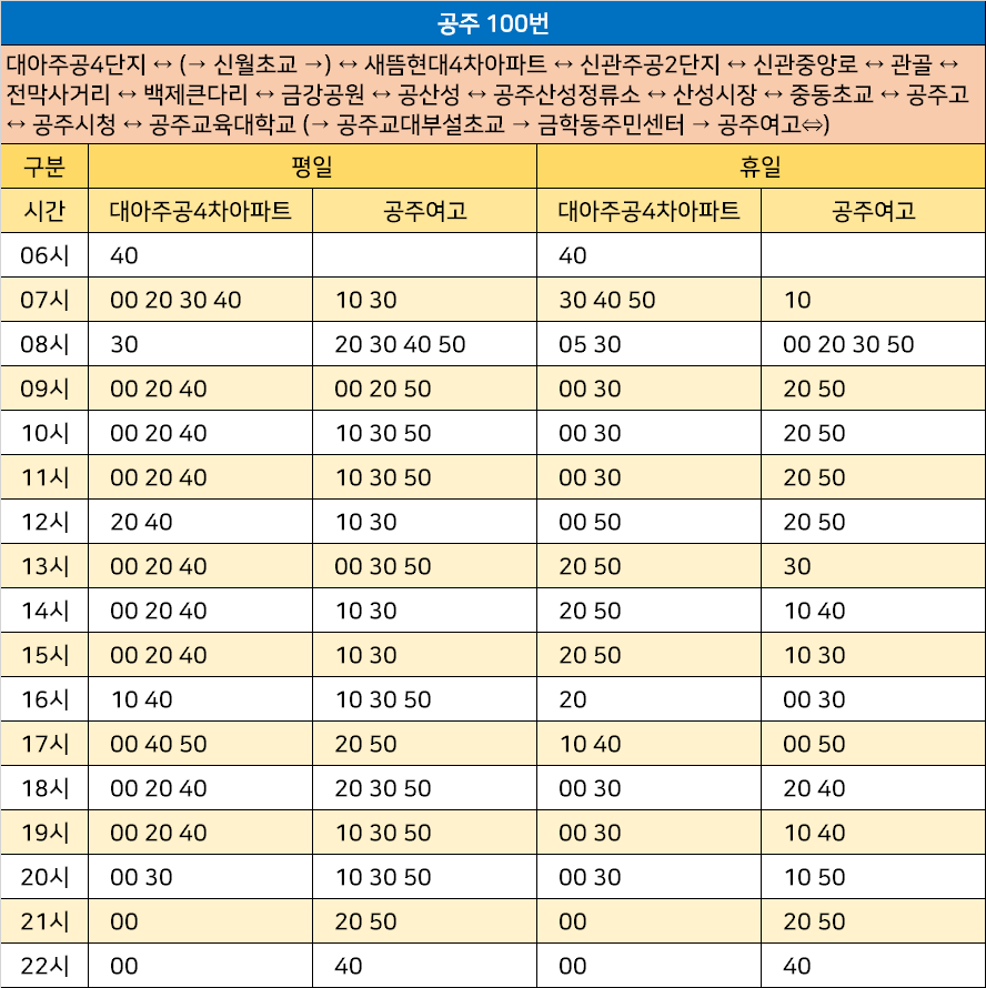 공주 100번: 대아주공4단지 ↔ (→ 신월초교 →) ↔ 새뜸현대4차아파트 ↔ 신관주공2단지 ↔ 신관중앙로 ↔ 관골 ↔ 전막사거리 ↔ 백제큰다리 ↔ 금강공원 ↔ 공산성 ↔ 공주산성정류소 ↔ 산성시장 ↔ 중동초교 ↔ 공주고 ↔ 공주시청 ↔ 공주교육대학교 (→ 공주교대부설초교 → 금학동주민센터 → 공주여고⇔)