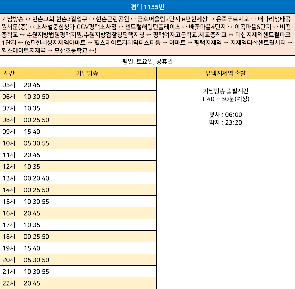 평택 1155번: 기남방송 ↔ 현촌교회.현촌3길입구 ↔ 현촌근린공원 ↔ 금호어울림2단지.e편한세상 ↔ 용죽푸르지오 ↔ 배다리생태공원서문(중) ↔ 소사벌중심상가.CGV평택소사점 ↔ 센트럴해링턴플레이스 ↔ 배꽃마을4단지 ↔ 이곡마을6단지 ↔ 비전중학교 ↔ 수원지방법원평택지원.수원지방검찰청평택지청 ↔ 평택여자고등학교.세교중학교 ↔ 더샵지제역센트럴파크1단지 ↔ (e편한세상지제역아파트 → 힐스테이트지제역퍼스티움 → 이마트 → 평택지제역 → 지제역더샵센트럴시티 → 힐스테이트지제역 → 모산초등학교 ↔)