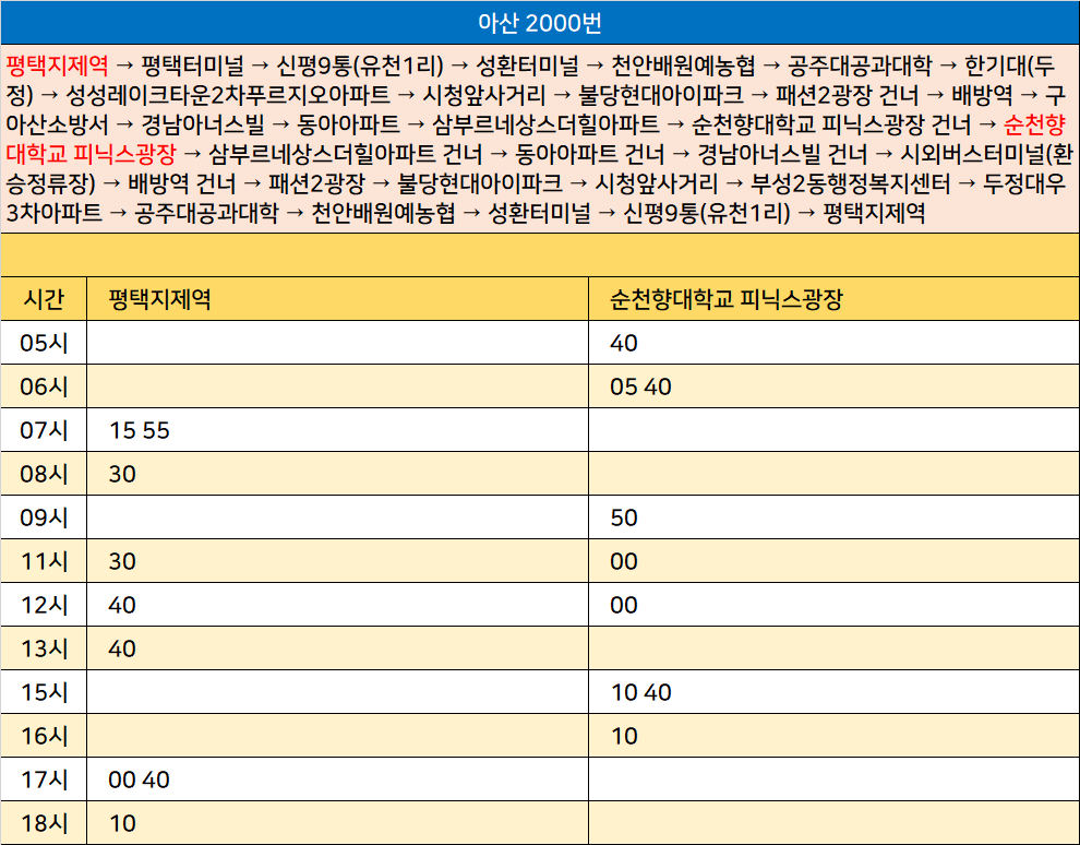 아산 2000번: 평택지제역 → 평택터미널 → 신평9통(유천1리) → 성환터미널 → 천안배원예농협 → 공주대공과대학 → 한기대(두정) → 성성레이크타운2차푸르지오아파트 → 시청앞사거리 → 불당현대아이파크 → 패션2광장 건너 → 배방역 → 구 아산소방서 → 경남아너스빌 → 동아아파트 → 삼부르네상스더힐아파트 → 순천향대학교 피닉스광장 건너 → 순천향대학교 피닉스광장 → 삼부르네상스더힐아파트 건너 → 동아아파트 건너 → 경남아너스빌 건너 → 시외버스터미널(환승정류장) → 배방역 건너 → 패션2광장 → 불당현대아이파크 → 시청앞사거리 → 부성2동행정복지센터 → 두정대우3차아파트 → 공주대공과대학 → 천안배원예농협 → 성환터미널 → 신평9통(유천1리) → 평택지제역