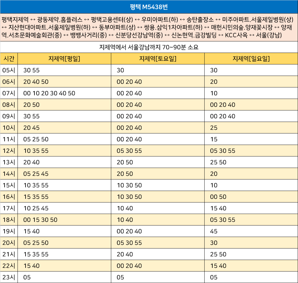 평택 M5438번: 평택지제역 ↔ 광동제약.홈플러스 ↔ 평택고용센터(상) ↔ 우미아파트(하) ↔ 송탄출장소 ↔ 미주아파트.서울제일병원(상) ↔ 지산현대아파트.서울제일병원(하) ↔ 동부아파트(상) ↔ 쌍용.삼익1차아파트(하) ↔ 매헌시민의숲.양재꽃시장 ↔ 양재역.서초문화예술회관(중) ↔ 뱅뱅사거리(중) ↔ 신분당선강남역(중) ↔ 신논현역.금강빌딩 ↔ KCC사옥 ↔ 서울(강남)