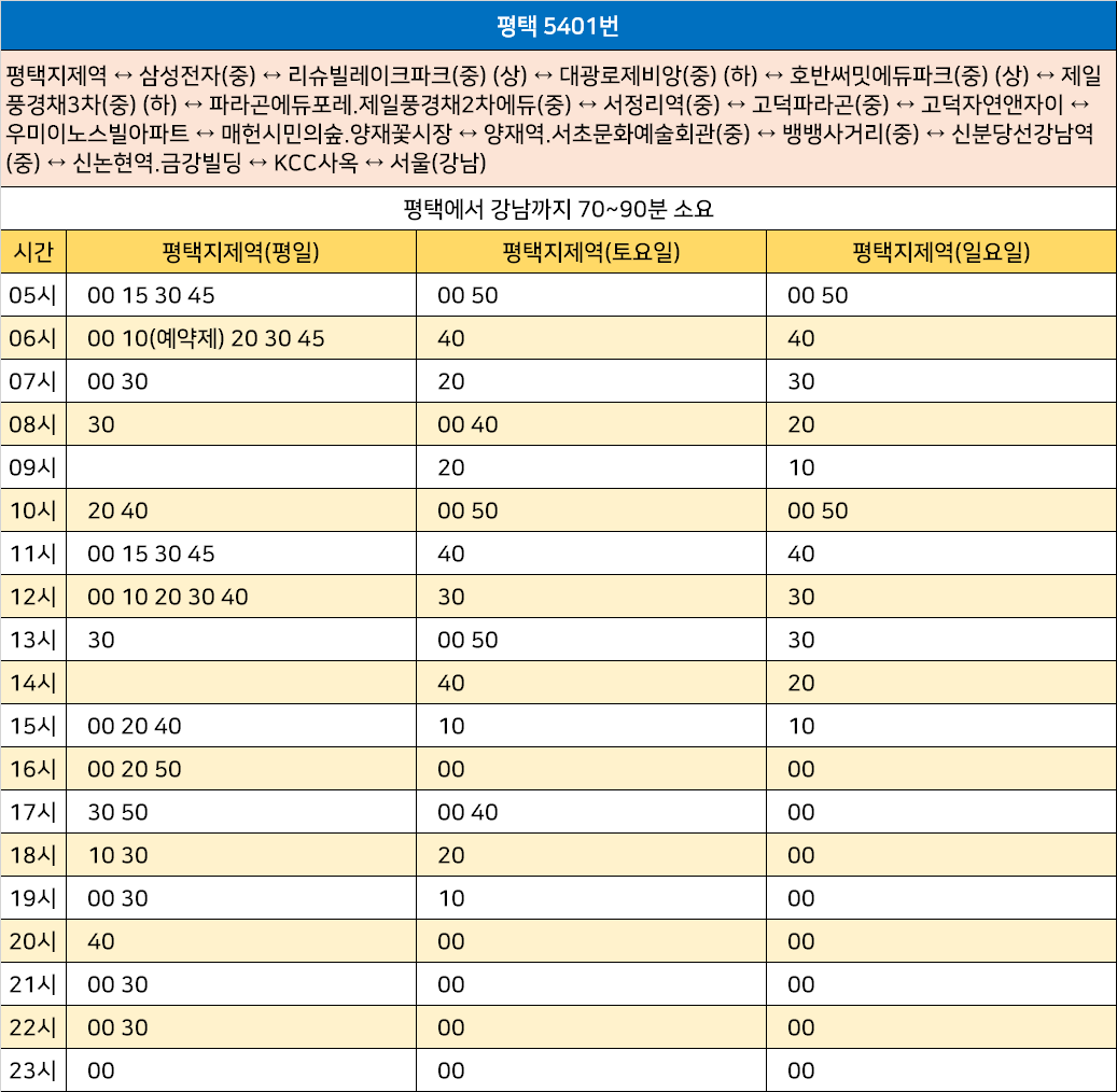 평택 5401번: 평택지제역 ↔ 삼성전자(중) ↔ 리슈빌레이크파크(중) (상) ↔ 대광로제비앙(중) (하) ↔ 호반써밋에듀파크(중) (상) ↔ 제일풍경채3차(중) (하) ↔ 파라곤에듀포레.제일풍경채2차에듀(중) ↔ 서정리역(중) ↔ 고덕파라곤(중) ↔ 고덕자연앤자이 ↔ 우미이노스빌아파트 ↔ 매헌시민의숲.양재꽃시장 ↔ 양재역.서초문화예술회관(중) ↔ 뱅뱅사거리(중) ↔ 신분당선강남역(중) ↔ 신논현역.금강빌딩 ↔ KCC사옥 ↔ 서울(강남)