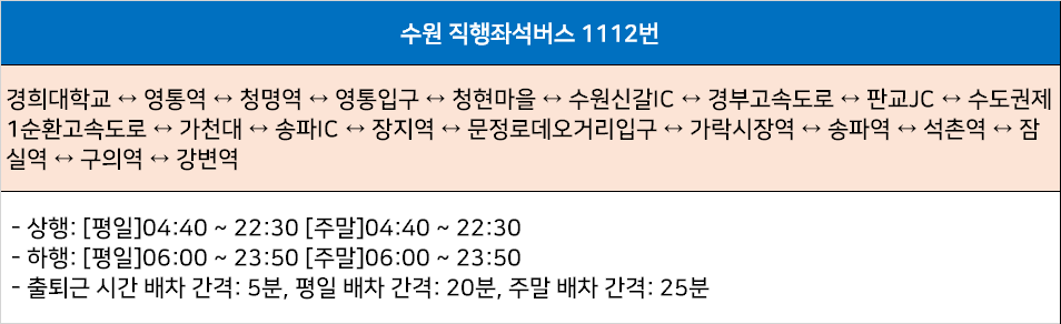 수원 직행좌석버스 1112번: 경희대학교 ↔ 영통역 ↔ 청명역 ↔ 영통입구 ↔ 청현마을 ↔ 수원신갈IC ↔ 경부고속도로 ↔ 판교JC ↔ 수도권제1순환고속도로 ↔ 가천대 ↔ 송파IC ↔ 장지역 ↔ 문정로데오거리입구 ↔ 가락시장역 ↔ 송파역 ↔ 석촌역 ↔ 잠실역 ↔ 구의역 ↔ 강변역