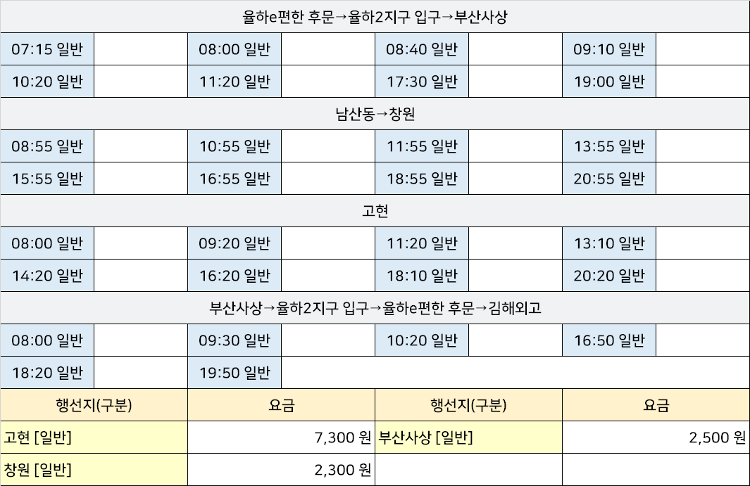 김해외고시외고속버스터미널 김해외고정류장 김해외고정류소 → "고현,남산동→창원,부산사상→율하2지구 입구→율하e편한 후문→김해외고,율하e편한 후문→율하2지구 입구→부산사상".