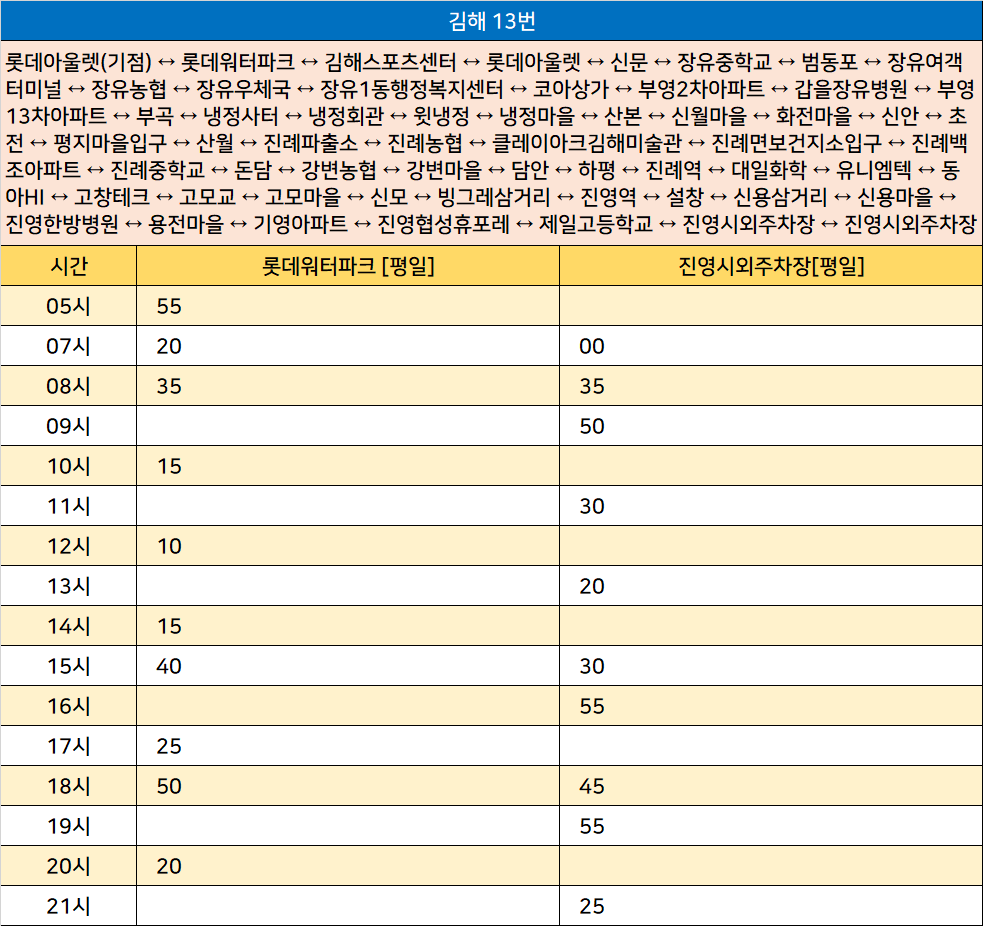 김해 13번: 롯데아울렛(기점) ↔ 롯데워터파크 ↔ 김해스포츠센터 ↔ 롯데아울렛 ↔ 신문 ↔ 장유중학교 ↔ 범동포 ↔ 장유여객터미널 ↔ 장유농협 ↔ 장유우체국 ↔ 장유1동행정복지센터 ↔ 코아상가 ↔ 부영2차아파트 ↔ 갑을장유병원 ↔ 부영13차아파트 ↔ 부곡 ↔ 냉정사터 ↔ 냉정회관 ↔ 윗냉정 ↔ 냉정마을 ↔ 산본 ↔ 신월마을 ↔ 화전마을 ↔ 신안 ↔ 초전 ↔ 평지마을입구 ↔ 산월 ↔ 진례파출소 ↔ 진례농협 ↔ 클레이아크김해미술관 ↔ 진례면보건지소입구 ↔ 진례백조아파트 ↔ 진례중학교 ↔ 돈담 ↔ 강변농협 ↔ 강변마을 ↔ 담안 ↔ 하평 ↔ 진례역 ↔ 대일화학 ↔ 유니엠텍 ↔ 동아HI ↔ 고창테크 ↔ 고모교 ↔ 고모마을 ↔ 신모 ↔ 빙그레삼거리 ↔ 진영역 ↔ 설창 ↔ 신용삼거리 ↔ 신용마을 ↔ 진영한방병원 ↔ 용전마을 ↔ 기영아파트 ↔ 진영협성휴포레 ↔ 제일고등학교 ↔ 진영시외주차장 ↔ 진영시외주차장
