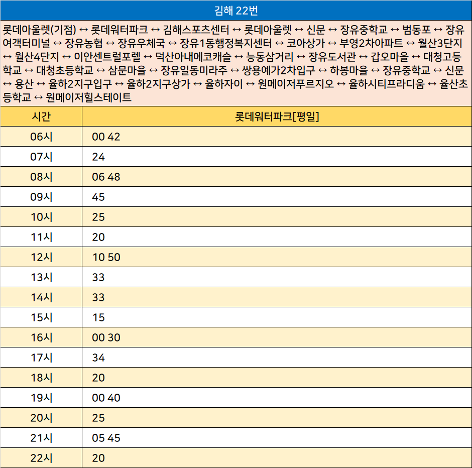 김해 22번: 롯데아울렛(기점) ↔ 롯데워터파크 ↔ 김해스포츠센터 ↔ 롯데아울렛 ↔ 신문 ↔ 장유중학교 ↔ 범동포 ↔ 장유여객터미널 ↔ 장유농협 ↔ 장유우체국 ↔ 장유1동행정복지센터 ↔ 코아상가 ↔ 부영2차아파트 ↔ 월산3단지 ↔ 월산4단지 ↔ 이안센트럴포렐 ↔ 덕산아내에코캐슬 ↔ 능동삼거리 ↔ 장유도서관 ↔ 갑오마을 ↔ 대청고등학교 ↔ 대청초등학교 ↔ 삼문마을 ↔ 장유일동미라주 ↔ 쌍용예가2차입구 ↔ 하봉마을 ↔ 장유중학교 ↔ 신문 ↔ 용산 ↔ 율하2지구입구 ↔ 율하2지구상가 ↔ 율하자이 ↔ 원메이저푸르지오 ↔ 율하시티프라디움 ↔ 율산초등학교 ↔ 원메이저힐스테이트