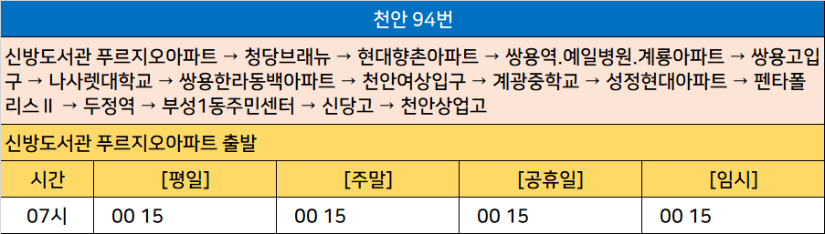 천안 94번: 신방도서관 푸르지오아파트 → 청당브래뉴 → 현대향촌아파트 → 쌍용역.예일병원.계룡아파트 → 쌍용고입구 → 나사렛대학교 → 쌍용한라동백아파트 → 천안여상입구 → 계광중학교 → 성정현대아파트 → 펜타폴리스Ⅱ → 두정역 → 부성1동주민센터 → 신당고 → 천안상업고