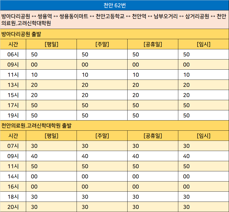 천안 62번: 방아다리공원 ↔ 쌍용역 ↔ 쌍용동이마트 ↔ 천안고등학교 ↔ 천안역 ↔ 남부오거리 ↔ 삼거리공원 ↔ 천안의료원.고려신학대학원