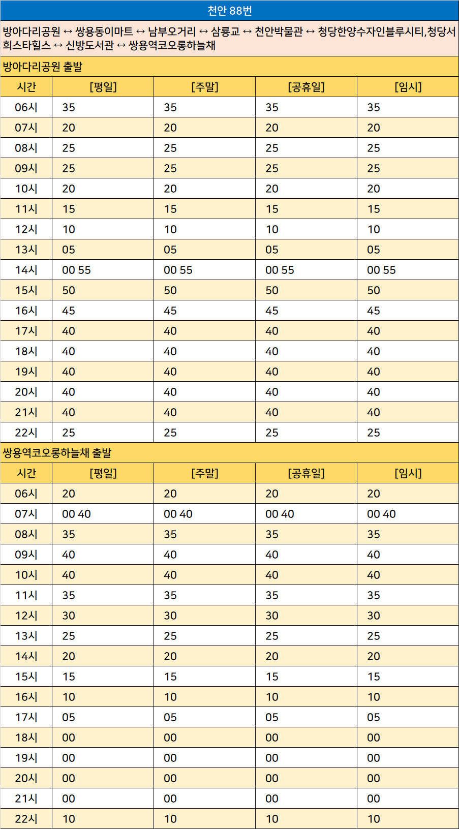 천안 88번: 방아다리공원 ↔ 쌍용동이마트 ↔ 남부오거리 ↔ 삼룡교 ↔ 천안박물관 ↔ 청당한양수자인블루시티,청당서희스타힐스 ↔ 신방도서관 ↔ 쌍용역코오롱하늘채