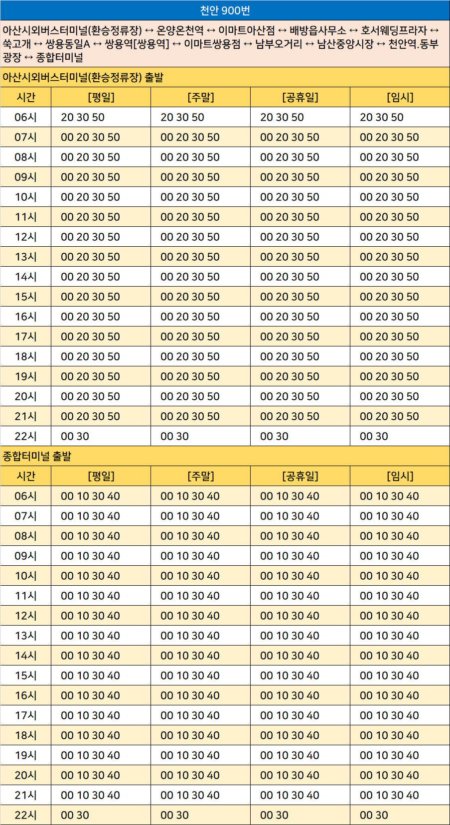 천안 900번: 아산시외버스터미널(환승정류장) ↔ 온양온천역 ↔ 이마트아산점 ↔ 배방읍사무소 ↔ 호서웨딩프라자 ↔ 쑥고개 ↔ 쌍용동일A ↔ 쌍용역 ↔ 이마트쌍용점 ↔ 남부오거리 ↔ 남산중앙시장 ↔ 천안역.동부광장 ↔ 종합터미널