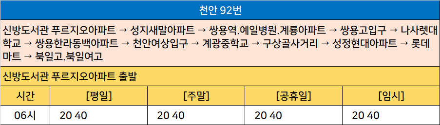 천안 92번: 신방도서관 푸르지오아파트 → 성지새말아파트 → 쌍용역.예일병원.계룡아파트 → 쌍용고입구 → 나사렛대학교 → 쌍용한라동백아파트 → 천안여상입구 → 계광중학교 → 구상골사거리 → 성정현대아파트 → 롯데마트 → 북일고.북일여고