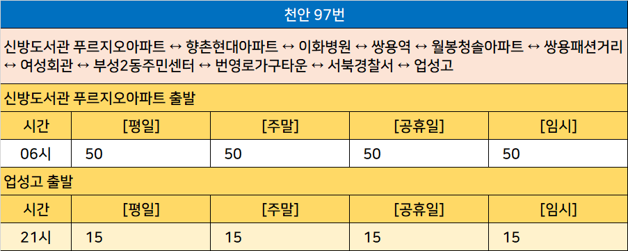 천안 97번: 신방도서관 푸르지오아파트 ↔ 향촌현대아파트 ↔ 이화병원 ↔ 쌍용역 ↔ 월봉청솔아파트 ↔ 쌍용패션거리 ↔ 여성회관 ↔ 부성2동주민센터 ↔ 번영로가구타운 ↔ 서북경찰서 ↔ 업성고