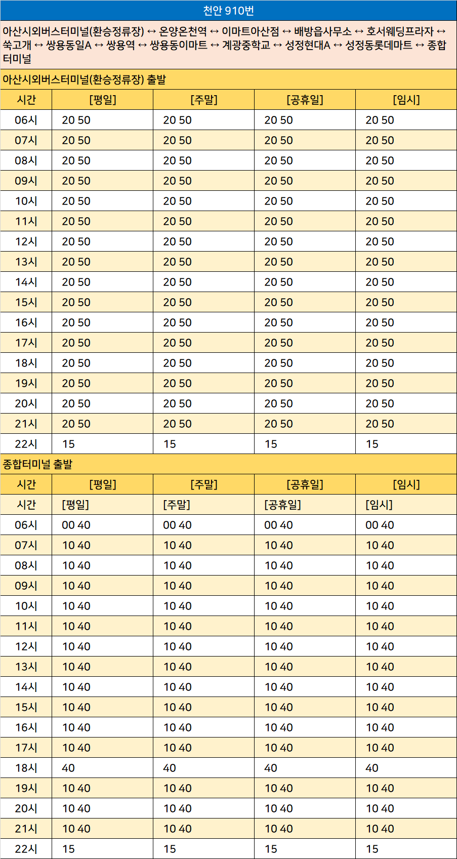 천안 910번: 아산시외버스터미널(환승정류장) ↔ 온양온천역 ↔ 이마트아산점 ↔ 배방읍사무소 ↔ 호서웨딩프라자 ↔ 쑥고개 ↔ 쌍용동일A ↔ 쌍용역 ↔ 쌍용동이마트 ↔ 계광중학교 ↔ 성정현대A ↔ 성정동롯데마트 ↔ 종합터미널