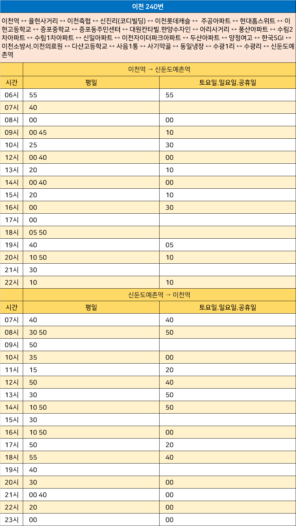 이천 240번: 이천역 ↔ 율현사거리 ↔ 이천축협 ↔ 신진리(코디빌딩) ↔ 이천롯데캐슬 ↔ 주공아파트 ↔ 현대홈스위트 ↔ 이현고등학교 ↔ 증포중학교 ↔ 증포동주민센터 ↔ 대원칸타빌.한양수자인 ↔ 아리사거리 ↔ 풍산아파트 ↔ 수림2차아파트 ↔ 수림1차아파트 ↔ 신일아파트 ↔ 이천자이더파크아파트 ↔ 두산아파트 ↔ 양정여고 ↔ 한국SGI ↔ 이천소방서.이천의료원 ↔ 다산고등학교 ↔ 사음1통 ↔ 사기막골 ↔ 동일냉장 ↔ 수광1리 ↔ 수광리 ↔ 신둔도예촌역
