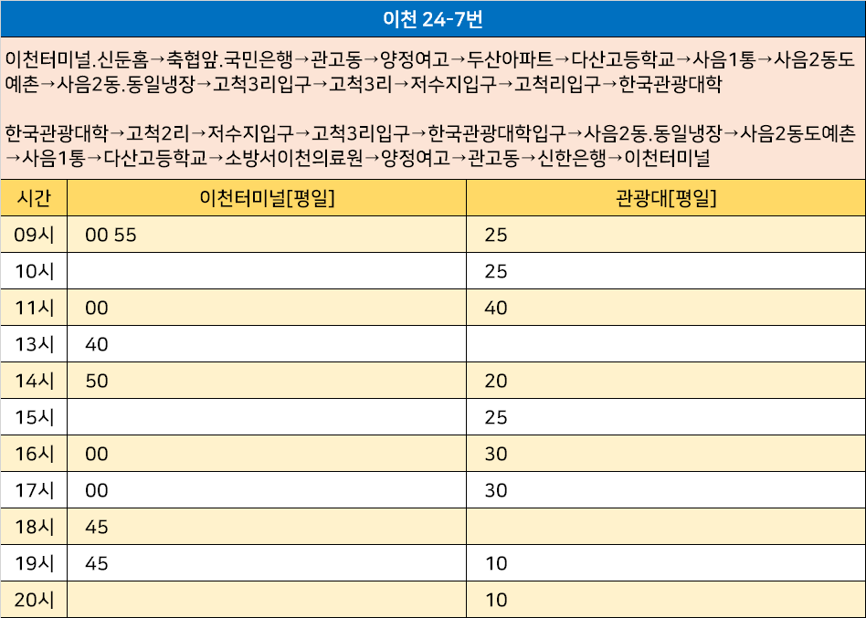 이천 24-7번: 이천터미널.신둔홈→축협앞.국민은행→관고동→양정여고→두산아파트→다산고등학교→사음1통→사음2동도예촌→사음2동.동일냉장→고척3리입구→고척3리→저수지입구→고척리입구→한국관광대학 / 한국관광대학→고척2리→저수지입구→고척3리입구→한국관광대학입구→사음2동.동일냉장→사음2동도예촌→사음1통→다산고등학교→소방서이천의료원→양정여고→관고동→신한은행→이천터미널