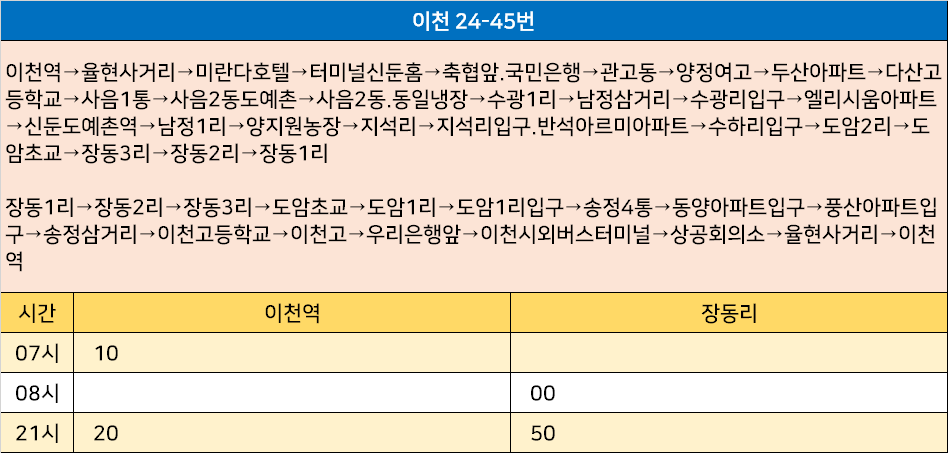 이천 24-45번: 이천역→율현사거리→미란다호텔→터미널신둔홈→축협앞.국민은행→관고동→양정여고→두산아파트→다산고등학교→사음1통→사음2동도예촌→사음2동.동일냉장→수광1리→남정삼거리→수광리입구→엘리시움아파트→신둔도예촌역→남정1리→양지원농장→지석리→지석리입구.반석아르미아파트→수하리입구→도암2리→도암초교→장동3리→장동2리→장동1리 / 장동1리→장동2리→장동3리→도암초교→도암1리→도암1리입구→송정4통→동양아파트입구→풍산아파트입구→송정삼거리→이천고등학교→이천고→우리은행앞→이천시외버스터미널→상공회의소→율현사거리→이천역