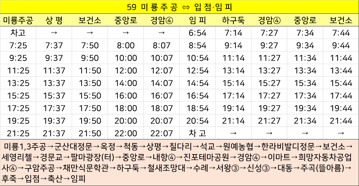 군산 59번: 미룡1,3주공→군산대정문→옥정→척동→상평→칠다리→석교→원예농협→한라비발디정문→보건소→세영리첼→경문교→팔마광장(터)→중앙로→내항④→진포테마공원→경암④→이마트→희망자동차공업사④→구암주공→채만식문학관→금강미래체험관→하구둑→철새조망대→수례→서왕③→신성③→대동→주곡(뜰아름)→후죽→입점→축산→임피