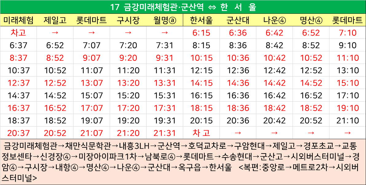 군산 17번: 금강미래체험관→채만식문학관→내흥3LH→군산역→호덕교차로→구암현대→제일고→경포초교→교통정보센타→신경장④→미장아이파크1차→남북로④→롯데마트→수송현대→군산고→시외버스터미널→경암④→구시장→내항④→명산④→나운④→군산대→옥구읍→한서울 <복편:중앙로→메트로2차→시외버스터미널>