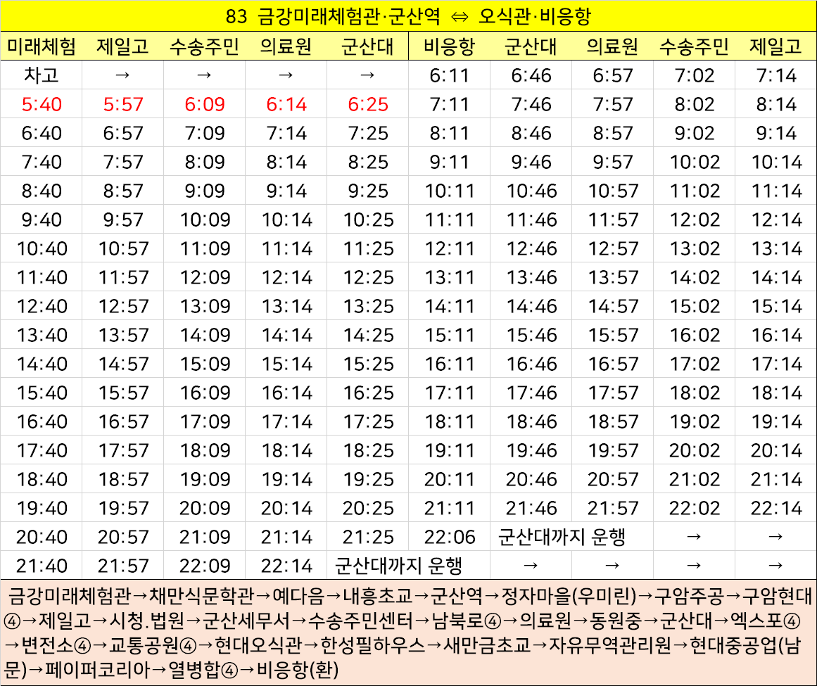 군산 83번: 금강미래체험관→채만식문학관→예다음→내흥초교→군산역→정자마을(우미린)→구암주공→구암현대④→제일고→시청.법원→군산세무서→수송주민센터→남북로④→의료원→동원중→군산대→엑스포④→변전소④→교통공원④→현대오식관→한성필하우스→새만금초교→자유무역관리원→현대중공업(남문)→페이퍼코리아→열병합④→비응항(환)