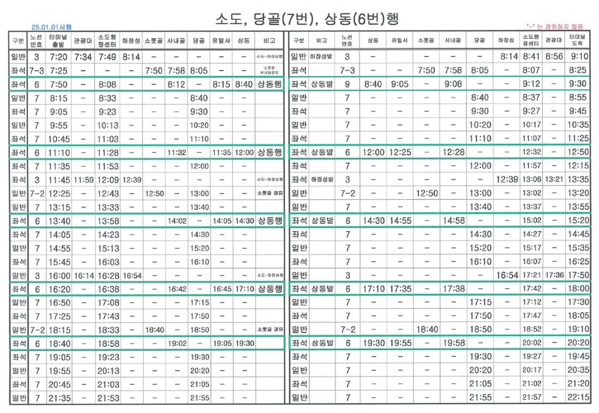상동 시외고속버스 터미널 시간표/요금표 2025년 04월 26일 기준