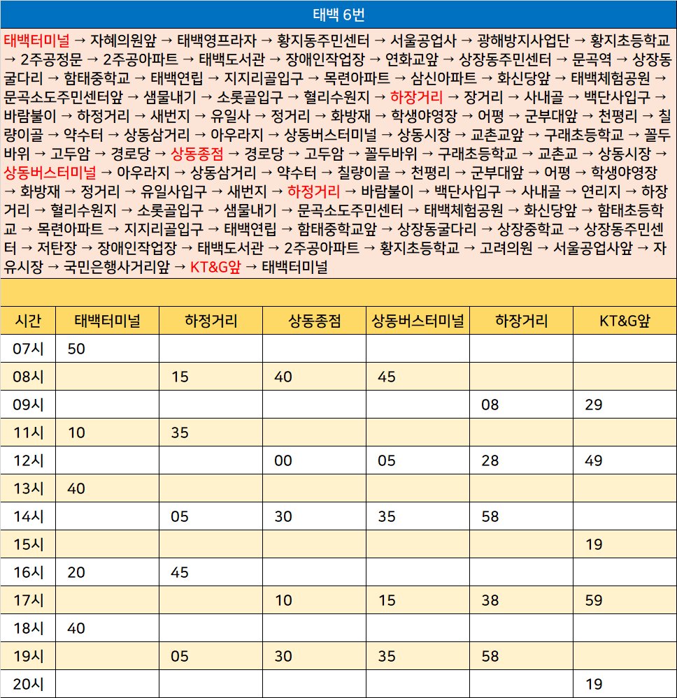 태백 6번: 태백터미널 → 자혜의원앞 → 태백영프라자 → 황지동주민센터 → 서울공업사 → 광해방지사업단 → 황지초등학교 → 2주공정문 → 2주공아파트 → 태백도서관 → 장애인작업장 → 연화교앞 → 상장동주민센터 → 문곡역 → 상장동굴다리 → 함태중학교 → 태백연립 → 지지리골입구 → 목련아파트 → 삼신아파트 → 화신당앞 → 태백체험공원 → 문곡소도주민센터앞 → 샘물내기 → 소롯골입구 → 혈리수원지 → 하장거리 → 장거리 → 사내골 → 백단사입구 → 바람불이 → 하정거리 → 새번지 → 유일사 → 정거리 → 화방재 → 학생야영장 → 어평 → 군부대앞 → 천평리 → 칠량이골 → 약수터 → 상동삼거리 → 아우라지 → 상동버스터미널 → 상동시장 → 교촌교앞 → 구래초등학교 → 꼴두바위 → 고두암 → 경로당 → 상동종점 → 경로당 → 고두암 → 꼴두바위 → 구래초등학교 → 교촌교 → 상동시장 → 상동버스터미널 → 아우라지 → 상동삼거리 → 약수터 → 칠량이골 → 천평리 → 군부대앞 → 어평 → 학생야영장 → 화방재 → 정거리 → 유일사입구 → 새번지 → 하정거리 → 바람불이 → 백단사입구 → 사내골 → 연리지 → 하장거리 → 혈리수원지 → 소롯골입구 → 샘물내기 → 문곡소도주민센터 → 태백체험공원 → 화신당앞 → 함태초등학교 → 목련아파트 → 지지리골입구 → 태백연립 → 함태중학교앞 → 상장동굴다리 → 상장중학교 → 상장동주민센터 → 저탄장 → 장애인작업장 → 태백도서관 → 2주공아파트 → 황지초등학교 → 고려의원 → 서울공업사앞 → 자유시장 → 국민은행사거리앞 → KT&G앞 → 태백터미널
