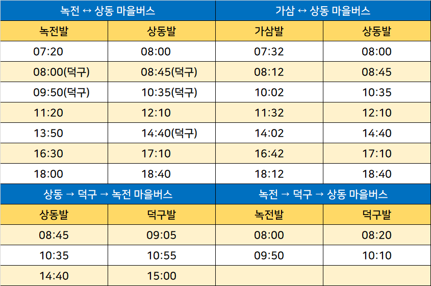 상동버스터미널 노선정보: 녹전 ↔ 상동, 가삼 ↔ 상동, 상동 → 덕구 → 녹전, 녹전 → 덕구 → 상동