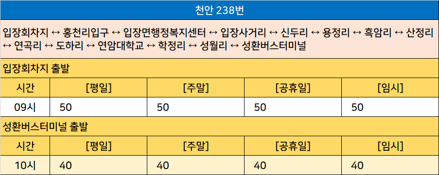 천안 238번: 입장회차지 ↔ 홍천리입구 ↔ 입장면행정복지센터 ↔ 입장사거리 ↔ 신두리 ↔ 용정리 ↔ 흑암리 ↔ 산정리 ↔ 연곡리 ↔ 도하리 ↔ 연암대학교 ↔ 학정리 ↔ 성월리 ↔ 성환버스터미널