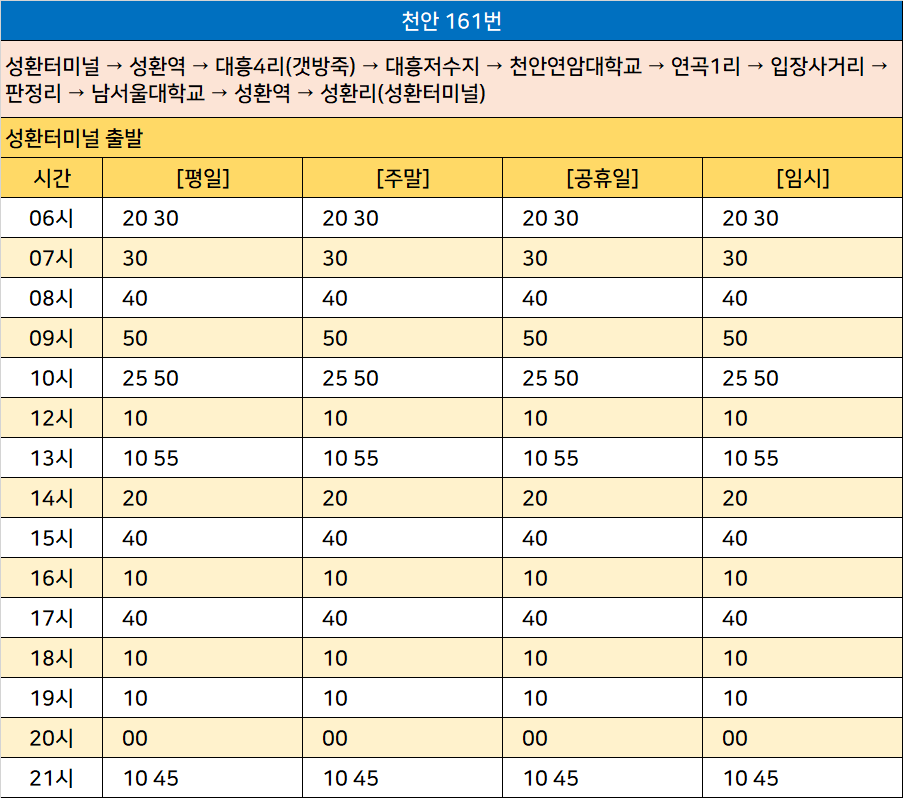 천안 161번: 성환터미널 → 성환역 → 대흥4리(갯방죽) → 대흥저수지 → 천안연암대학교 → 연곡1리 → 입장사거리 → 판정리 → 남서울대학교 → 성환역 → 성환리(성환터미널)