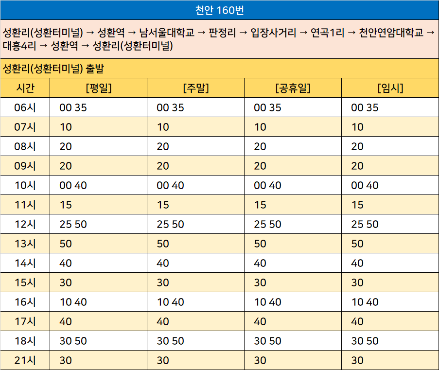 천안 160번: 성환리(성환터미널) → 성환역 → 남서울대학교 → 판정리 → 입장사거리 → 연곡1리 → 천안연암대학교 → 대흥4리 → 성환역 → 성환리(성환터미널)