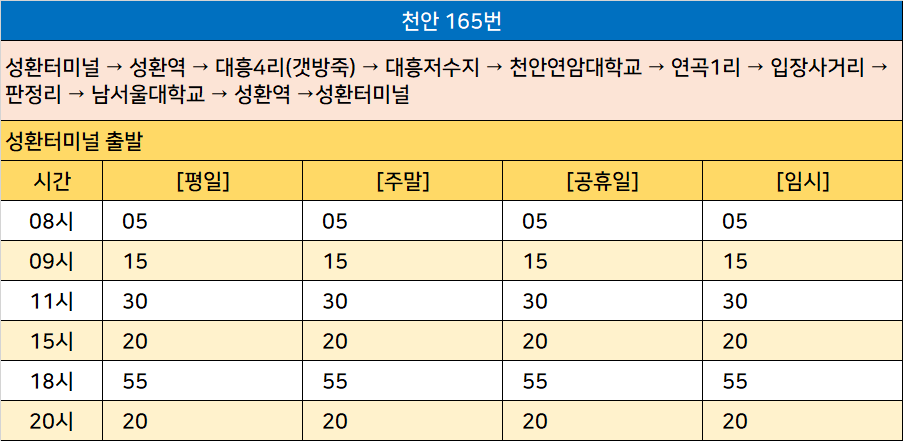 천안 165번: 성환터미널 → 성환역 → 대흥4리(갯방죽) → 대흥저수지 → 천안연암대학교 → 연곡1리 → 입장사거리 → 판정리 → 남서울대학교 → 성환역 →성환터미널