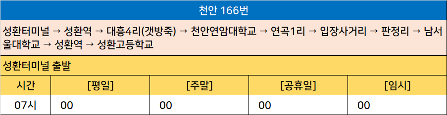 천안 166번: 성환터미널 → 성환역 → 대흥4리(갯방죽) → 천안연암대학교 → 연곡1리 → 입장사거리 → 판정리 → 남서울대학교 → 성환역 → 성환고등학교